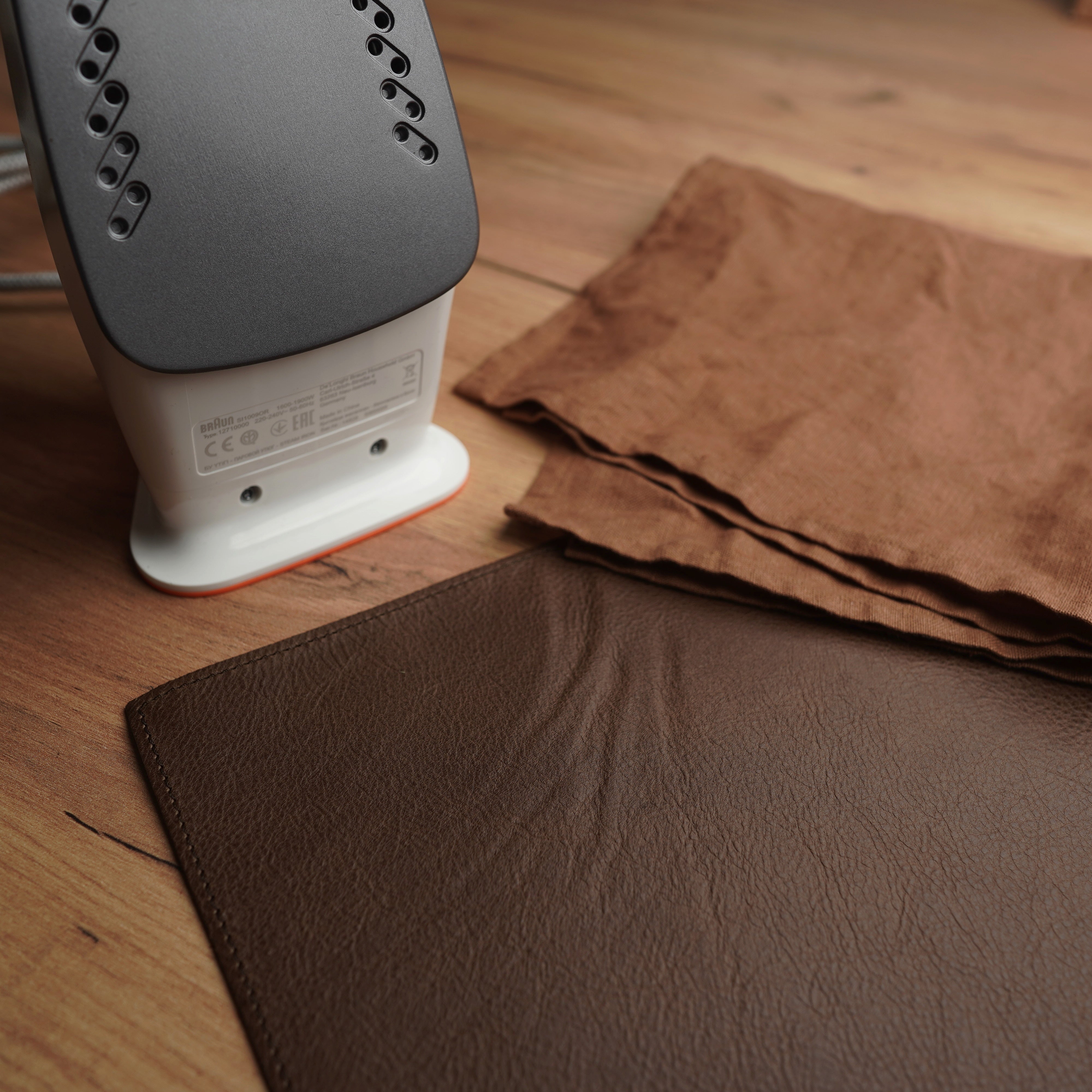 Lassen Sie das Leder bei Raumtemperatur trocknen. Nasses Narbenleder ist empfindlich und kann bei zu viel Temperatur schrumpfen - Trocknen Sie Ihr Produkt also niemals im Ofen oder auf der Heizung!
