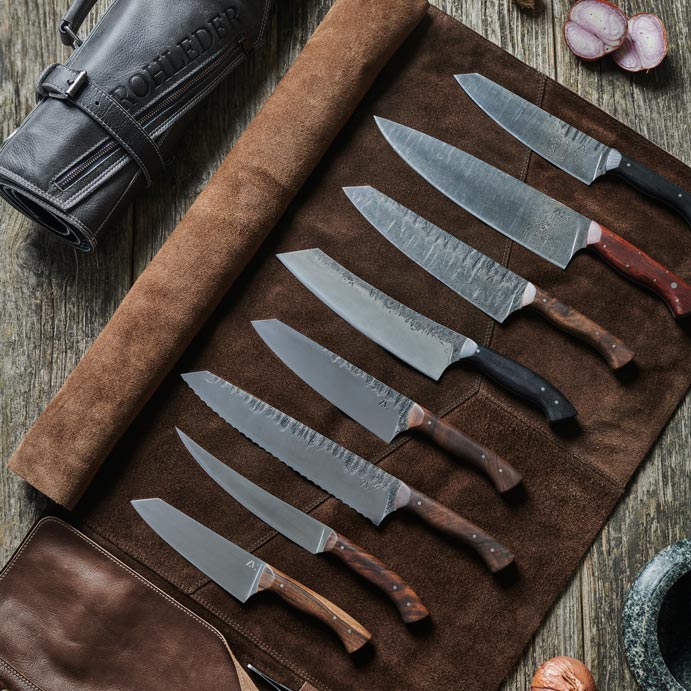 Die charakteristische, rustikale Schmiedeoberfläche mit den sichtbaren Hammerschlägen und die individuellen Griffschalen aus unterschiedlichen heimischen oder auch exotischen Hölzern machen das Messer zu einem wahren Kunstwerk, das seinesgleichen sucht.